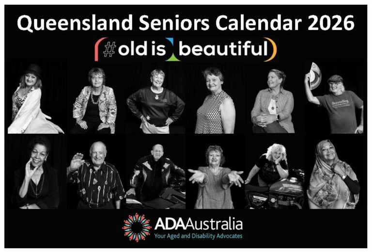 Our 2026 Seniors Calendar is here! This is our 5th edition of our Queensland Seniors Calendar and for this year’s theme, we have partnered with Celebrate Ageing on the #OldIsBeautiful project. This project offers workshops/discussions with older people to combat internalised ageism and document their portraits and messages about beauty. The black and white portraits of older people are paired with messages and musings to help combat ageism in the community.