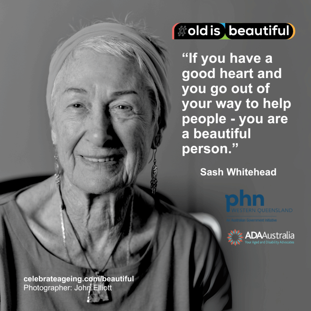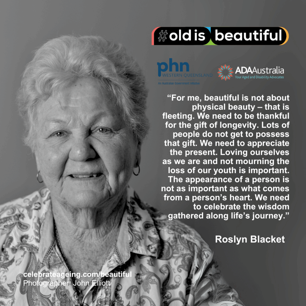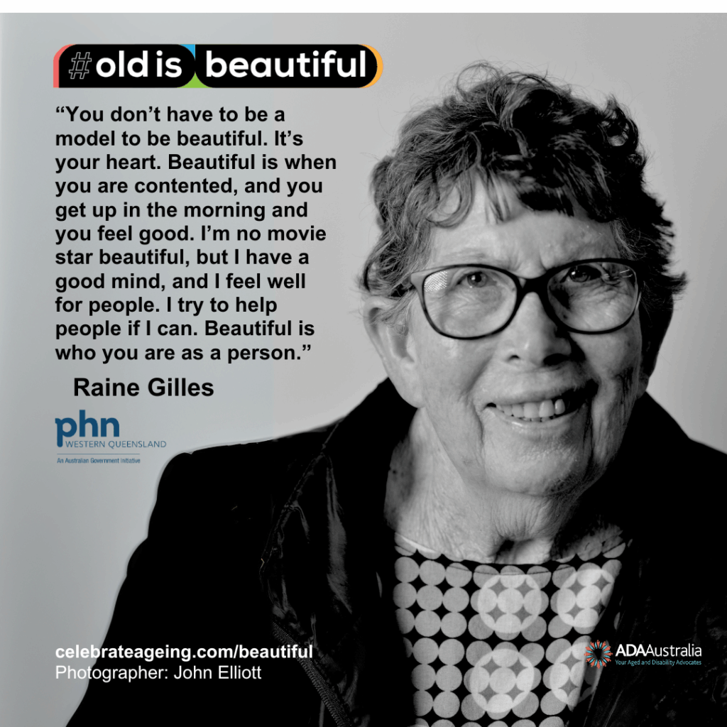 The ageist view that beauty is limited to youth is harmful to older people and society more broadly. It devalues and socially isolates older people, erodes their health and wellbeing, and robs those who are not yet old of an optimistic ageing pathway. In response to this issue, the #OldisBeautiful project Brisbane, hosted in partnership between Celebrate Ageing, ADA Australia and Brisbane City Council offers workshops/discussion with older people to combat internalised ageism and document their portraits and messages about beautiful. The black and white portraits of older people, and their messages are shared to help combat ageism in the community.