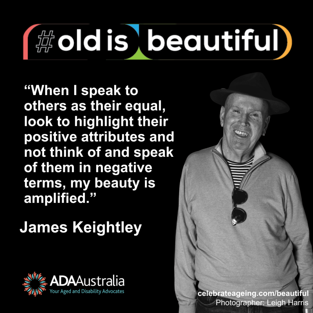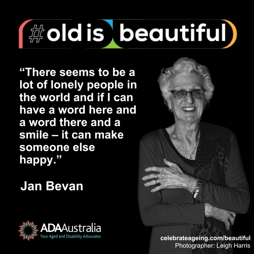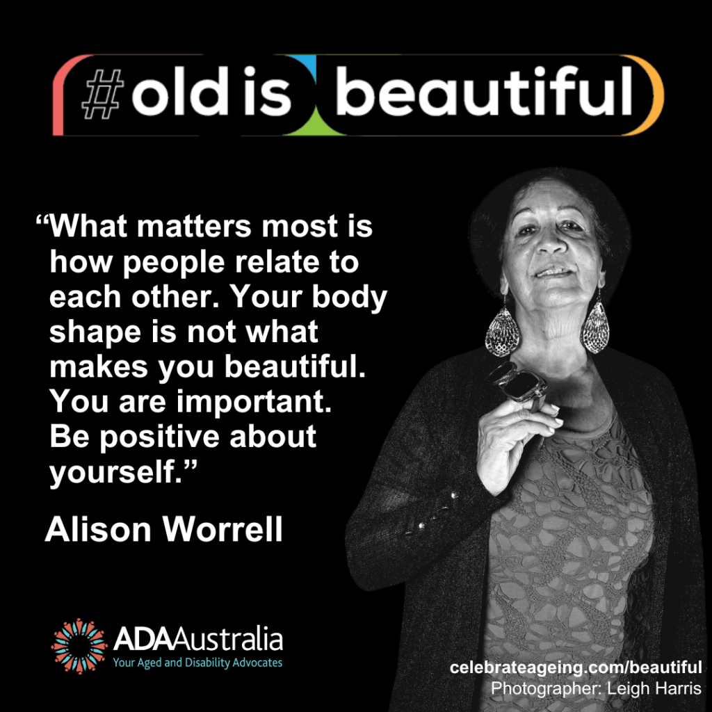 The ageist view that beauty is limited to youth is harmful to older people and society more broadly. It devalues and socially isolates older people, erodes their health and wellbeing, and robs those who are not yet old of an optimistic ageing pathway. In response to this issue, the #OldisBeautiful project Brisbane, hosted in partnership between Celebrate Ageing, ADA Australia and Brisbane City Council offers workshops/discussion with older people to combat internalised ageism and document their portraits and messages about beautiful. The black and white portraits of older people, and their messages are shared to help combat ageism in the community.